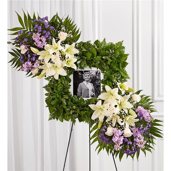 Celebrate the cherished memories you shared with a beautiful floral arrangement. Our unique design features a square wreath of greenery—perfect for displaying a photo—and two sprays on each end gathered with soothing lavender & white blooms for a lush, full presentation. It’s a special tribute to honor the life of a loved one.